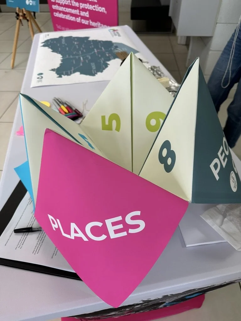 Recognising the scale and complexity of the task, we designed an engagement approach that was both robust and imaginative. Alongside stakeholder meetings and themed workshops, we developed playful and accessible tools that encouraged people of all ages to share their connections to place. One of these was a brief for a mini mobile museum, beautifully brought to life by designer Jonathan H. S. Ross. Another was a bespoke origami fortune teller, created as an intergenerational interview tool for schools, helping younger participants spark conversations with peers, parents, and grandparents about memory, identity, and local heritage.